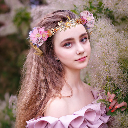 COSUCOS Classic Gold Ram Horn Crown Viking Sheep Horn Headband Elf Flower Tiara