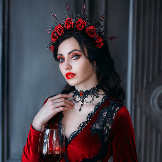 Black Red Rose Headband - Cosplay Costume Cross Halo Crown Spiked Sunburst Evil Gothic