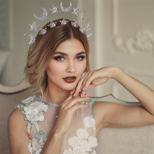 COSUCOS Sliver Moon Star Halo Crown - Celestial Headband with Rhinestones Goddess Headpiece